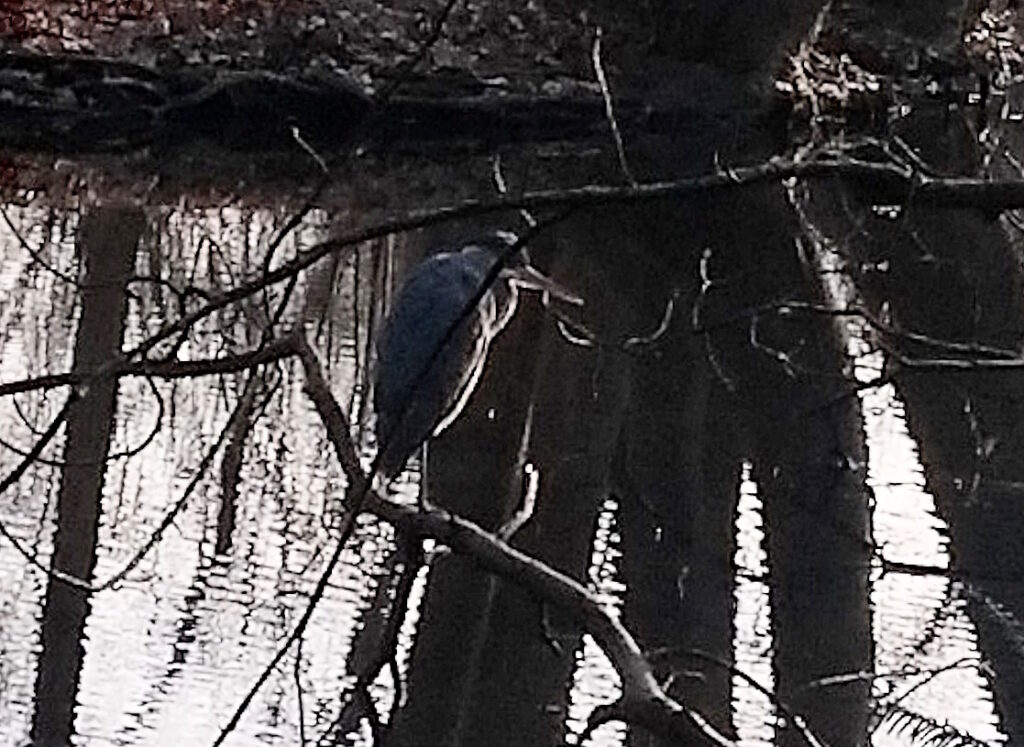 Anschließend ging es in guter Tradition hinunter zum Schlachtensee, wo ich diesmal nur sehr wenige Vögel sah, was sich in den nächsten Wochen naturgemäß ändern wird; Säugetiere begegneten mir gar keine (vom Homo sapiens und dessen Canis lupus familiaris mal abgesehen). Zu vermelden ist die Sichtung jeweils einer Kohlmeise, Amsel und Tannenmeise, eines fliegenden Graureihers sowie zweier Höckerschwäne und Blässhühner. In Ufernähe noch eine dünne und brüchige Eisschicht – sehr zur Freude eines jungen Mannes, der gerade ins Wasser stieg und mir fröhlich erzählte, dass er just in diesem Moment seinen Winterwasseraufenthaltsrekord von 45 Sekunden auf 1 Minute erhöhen wolle – was ihm dann gelang. Es sei erst das zweite Mal, dass er bei solchen Temperaturen bade – ich sprach ihm meinen Respekt aus.