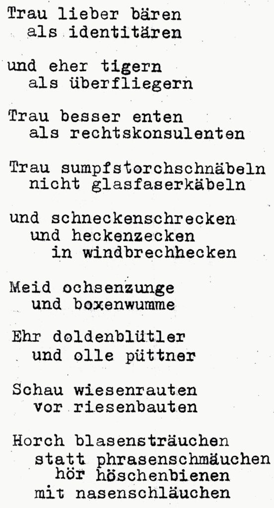 Dann zurück – mit Abstecher zum Flohmarkt auf der Straße des 17. Juni, der nun allmählich wie fast alle Flohmärkte Opfer der digitalen Marketplaces wird: kaum Menschen dort. Beim Weggehen erspähe ich in den Kisten eines resigniert zusammenpackenden alten Türken zwei Zigarettenbilderalben von 1937: „Aus Wald und Flur“ – einmal die Ausgabe mit den Tieren und einmal die mit den Pflanzen, beide vollständig für jeweils nen Fünfer, da handele ich nicht einmal mehr. Zuhause kann ich damit meine Frakturlesefertigkeiten neu beleben. Dazu ein frischer Wermutkraut-Chun-Mee-Aufguss, Käsestullen und die famose Nyahbingi-Box von Trojan Records. Weiter im Tagwerk.