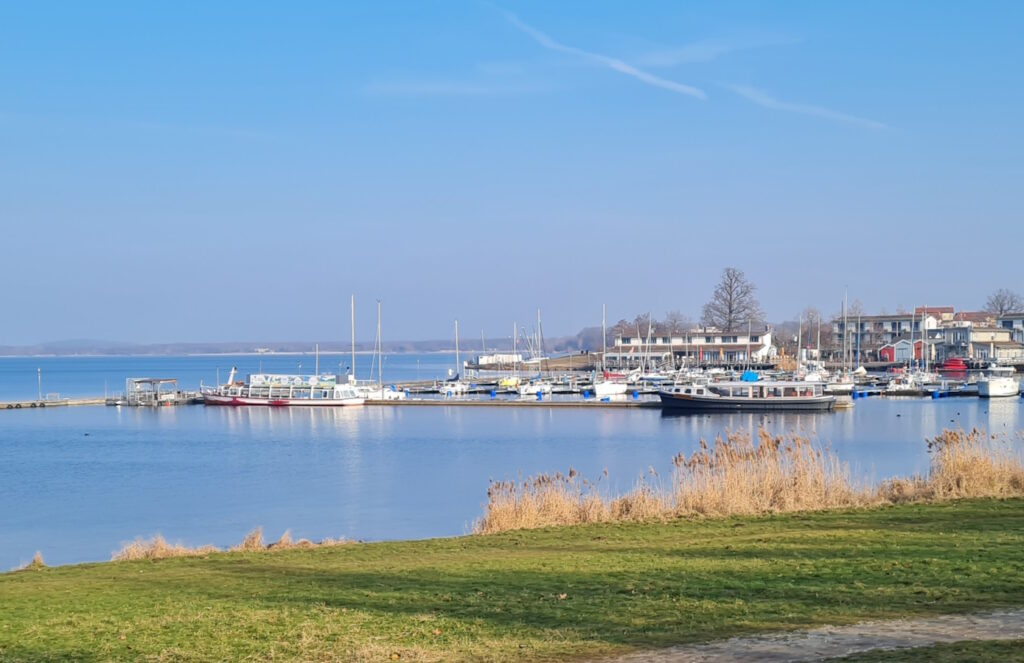 Unglaubliches Licht. Der Zöbigker Hafen leuchtet wie eine Fata Morgana am Horizont. Inzwischen bin ich weit über eine Stunde unterwegs, stehe aber laut Tracker erst bei 14 Kilometern. Fehlen noch 7,1.