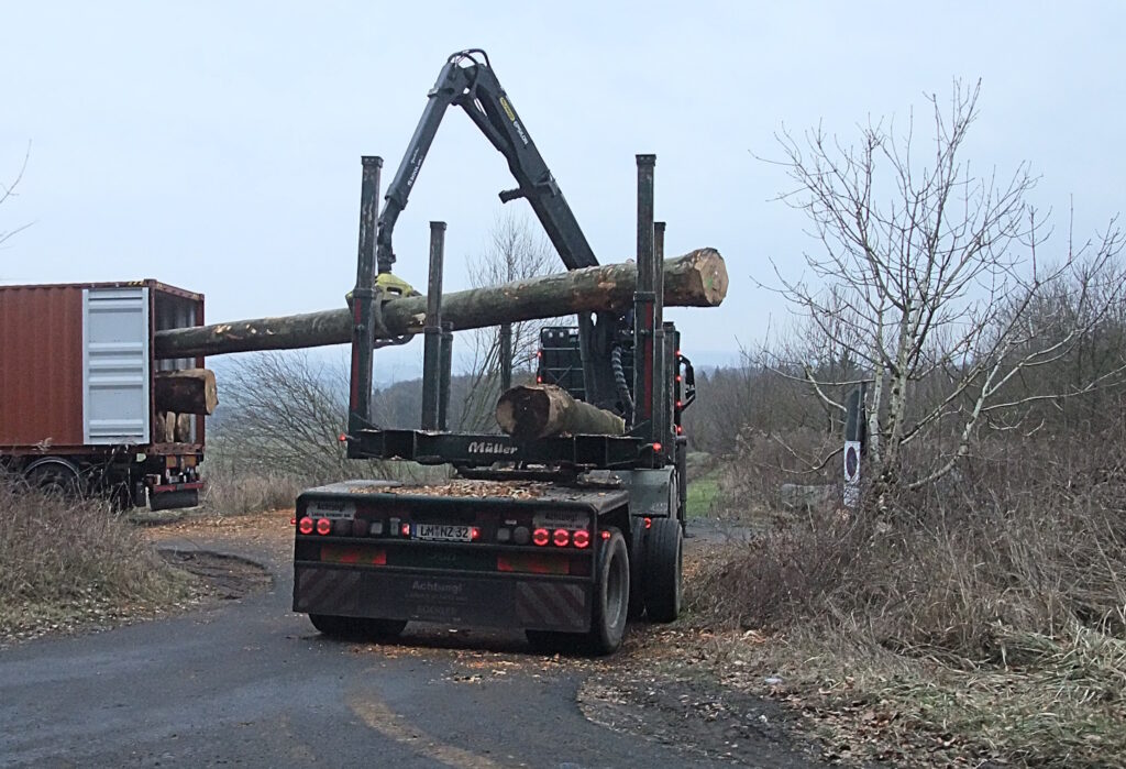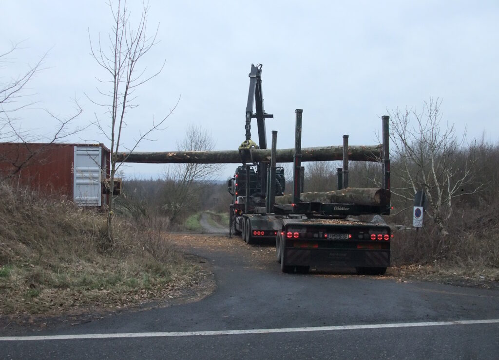 Nachmittags mit dem Holzverarbeiter gesprochen: Die vergangene Woche bei uns verladenen Buchen sind für die USA und VR China bestimmt. Daraus entstehen dann Möbel, die Amerikaner importieren zudem viel Langholz für den Häuserbau. Die bereits hier vor Ort abgeschälten Stämme werden in Belgien begast und kommen in Antwerpen auf die Schiffe. Die Gasbeflutung fand früher in den Containern selbst statt: Kartusche rein, verriegeln, kein Absaugen oder Filtern nach Öffnung, was inzwischen wegen der äußerst gefährlichen Giftstoffe an zertifizierte Betriebe ausgelagert wurde. Über die Treibhausemissionen und andere Umweltschädigungen spricht man dabei nicht so gern. Allerdings gehen gerade aktuell Gerüchte über ein Komplettverbot um, womit das unverzichtbare Überseegeschäft ausfallen würde … Danach sprachen wir über die sinnvollen und langlebigen Anwendungen von Holz im Alltag – die Frage, ob Schuhlöffel aus Metall sein müssen.