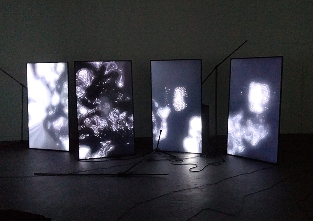 Bei der dritten Schau, Miloš Trakilović‘ Musik- und Video-Installation Not a Love Song, kam mir zugute, dass ich vorher nie etwas zu Werk und Künstler lese. Und so saß ich dann unbefangen im Flimmern der Bildschirme und ließ Bilder und Klänge in mich strömen … Es bilden sich Verknüpfungen mit den frühen Sonic Youth („Protect me you“), Tricky („Piano“) oder DJ Spooky with The Freight Elevator Quartet: Schleppende Beats, Keyboarddrones, kurz angeschlagene Gitarren … Industriebrachen … Fabrikhallen … Beton Beton … Manchester … Lubljana … Im Nachhinein stellte sich heraus, dass die Sounds von einer KI-Anwendung generiert waren. Die hatte Trakilović mit 564 Songs gefüttert, die in den vier Jahren vor Beginn des Bosnienkriegs (1994) in den Ländern der späteren Feinde veröffentlicht wurden. Das Programm erkannte Tonalitätsmuster, machte daraus Files und ließ mit einem zweiten Tool aus dieser Datenbank die Musik für die Ausstellung kreieren. Die Videos wurden von der KI sogar in Echtzeit erstellt und dann live gestreamt. Aus der Mensch-Maschine wird nun so langsam die Maschinen-Maschine. Und wir alle sind dabei. (?!)