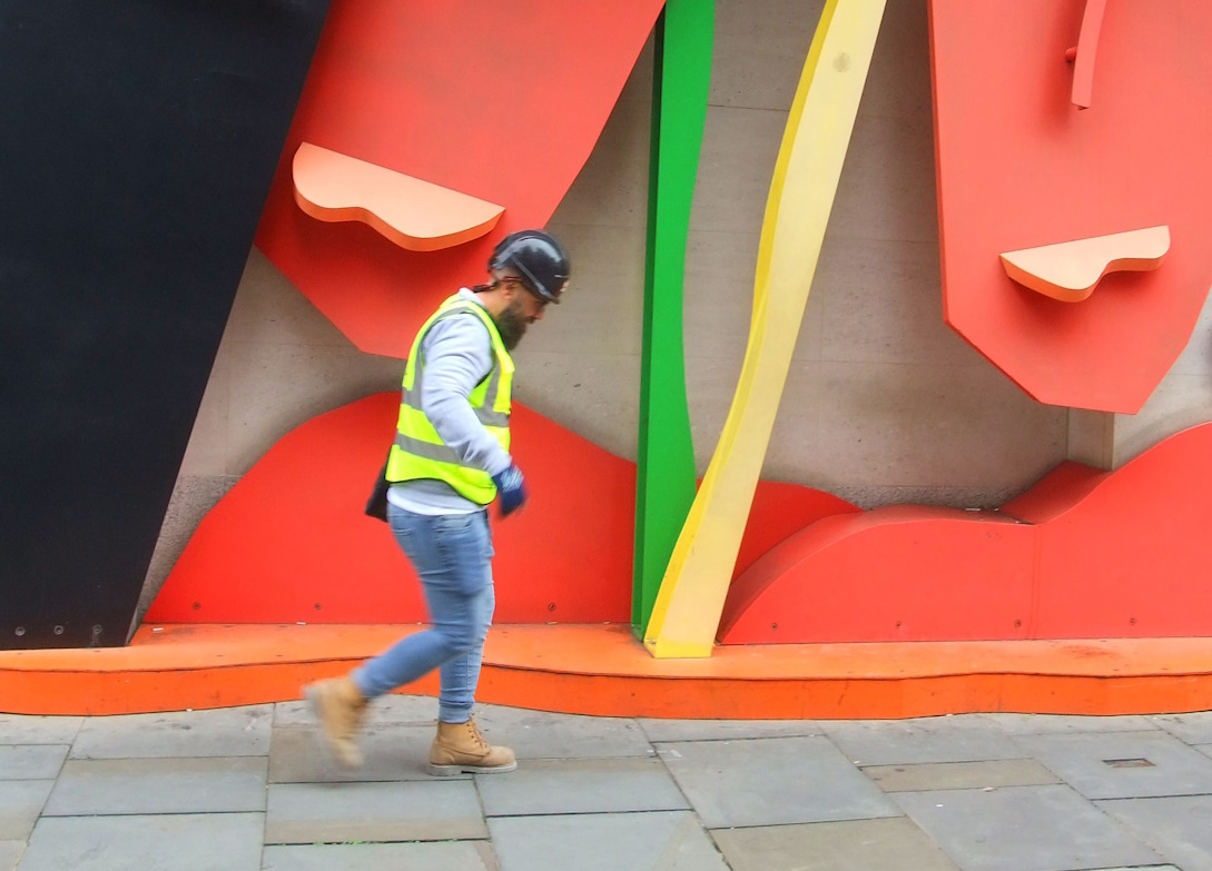 Bei leichten Plusgraden der Himmel tagsüber wie auf einem durch und durch grauen Aquarell ohne größeren Pigmenteinsatz. Trüber Höhepunkt eine Baustelle kurz vor dem U-Bahnhof Krumme Lanke, wo ich auf einer Ziegelmauer die leicht abgewaschene Aufschrift „Hilfskabel“ lese und ein Arbeiter mit orangebejacktem Oberkörper im Nieselregen aus einer Röhre ragt – er macht dabei keinen allzu glücklichen Eindruck.
