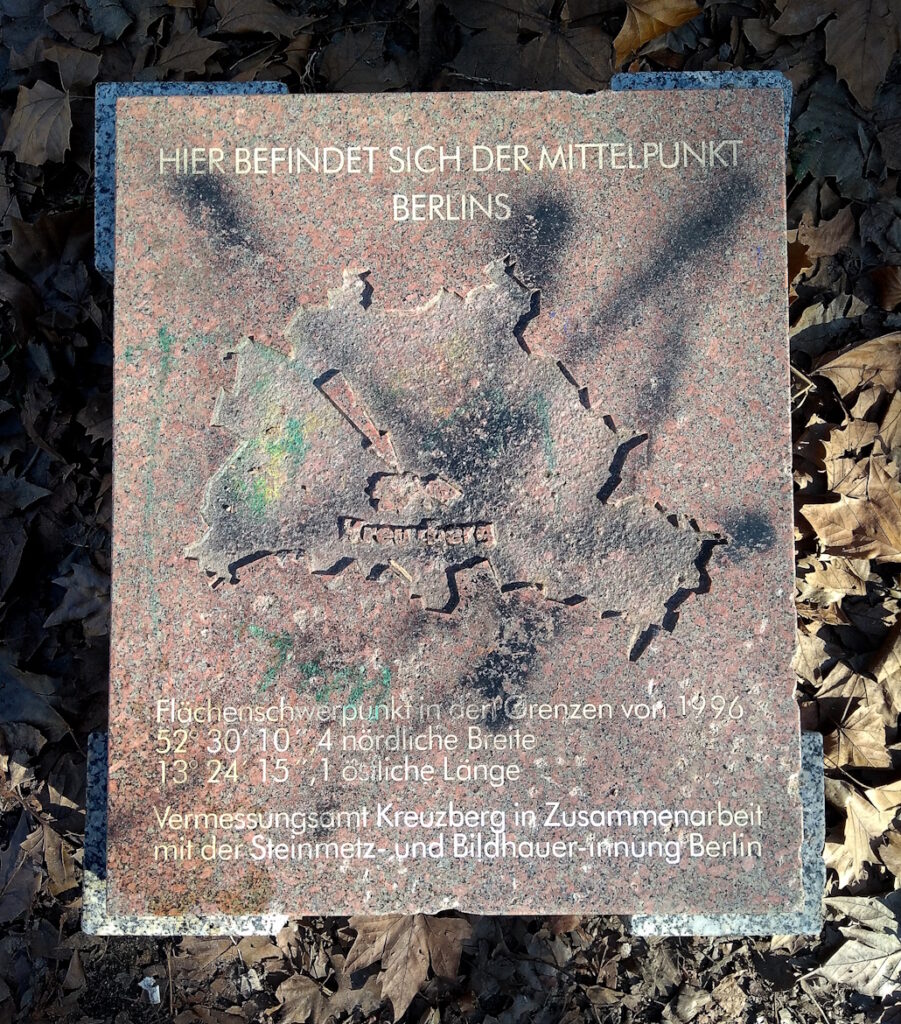 Die Luft seit Sonnabend irritierend mild, Temperaturen über 10° C. Vor der Seniorenresidenz neben dem Volkspark Wilmersdorf sind die Krokusse und Schneeglöckchen aufgegangen, Letztere auch im Park selbst. Suche nach dem Mittag in Kreuzberg die geografische Mitte Berlins. Die entsprechende Granitplatte muss man erst einmal finden im Hochhäusernirwana um die Alexandrinenstraße, zwischen Flächenentsiegelungsbaustelle, Sportanlage und Schule. Eigentlich liegt der Punkt 200 Meter weiter nordöstlich auf dem Gelände des BFC Südring, da man dort aber nicht so leicht raufkommt, wurde er einfach verlegt. So fängt das an – und am Ende schreibst du die Historie und Karten ganzer Länder um. (Immer alles nachmessen!)