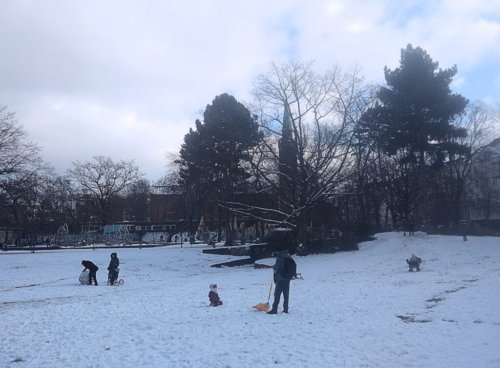 Morgens -8°C, die kürzlich gekaufte Thermohose hatte sich bereits mit Verlassen des Hofes amortisiert. Ein blauer Himmel mit kräftiger Sonne bei klarer, trockener Luft; im Laufe des Vormittags durch die zunehmende Bewölkung anmutungskühl, obwohl die Temperaturen bis auf -1°C stiegen. Hier und da leichte Schneeverwehungen, die Gehwege stellenweise überfroren. Ich hatte heute in Schönholz zu tun, einer sogenannten Ortslage im westlichen Niederschönhausen. Zu Mauerzeiten Sperrgebiet zwischen Ost und West und mir bislang unbekannt. Nachdem ich meinen Kram erledigt hatte, erkundete ich ein wenig die Gegend, wobei ich zwischen Bürgerpark, Friedhof und den S-Bahngleisen auf irgendein Betriebsgelände geriet. Alles etwas unübersichtlich – ich latschte direkt in den mehrere Männer starken Werkschutz rein. Was die da bewachen, konnte ich nicht genau erkennen, sah aus wie eine Funkanlage. Mir wurde dann freundlich der kürzeste Weg nach draußen gezeigt. Noch 1989 hätte dort eine vergleichbare Situation böse Folgen gehabt. Wir leben gerade in ruhigen Zeiten.