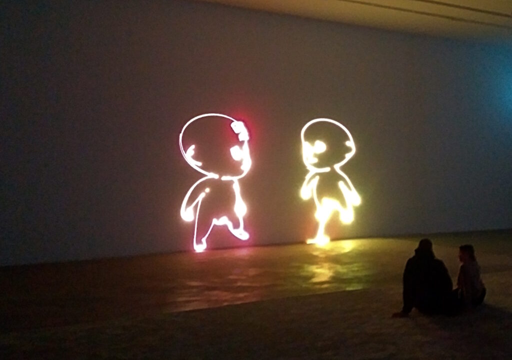Die drei neuen Ausstellungen in den Kunst-Werken Berlin lohnend: Matt Copson mit Age of Coming, einer Art elektronischer Laser-Oper über die ersten beiden neuen Wesen auf einem zuvor zerstörten Planeten irgendwie anrührend und formal dermaßen retro, dass es fast schon futuristisch wirkt. I lost my mother to the fire / I went to work as town crier / Strange situation / Earthly castration. Musik: Caroline Polaschek, Gesang: Kiran Subramanian und Simeon Wren.