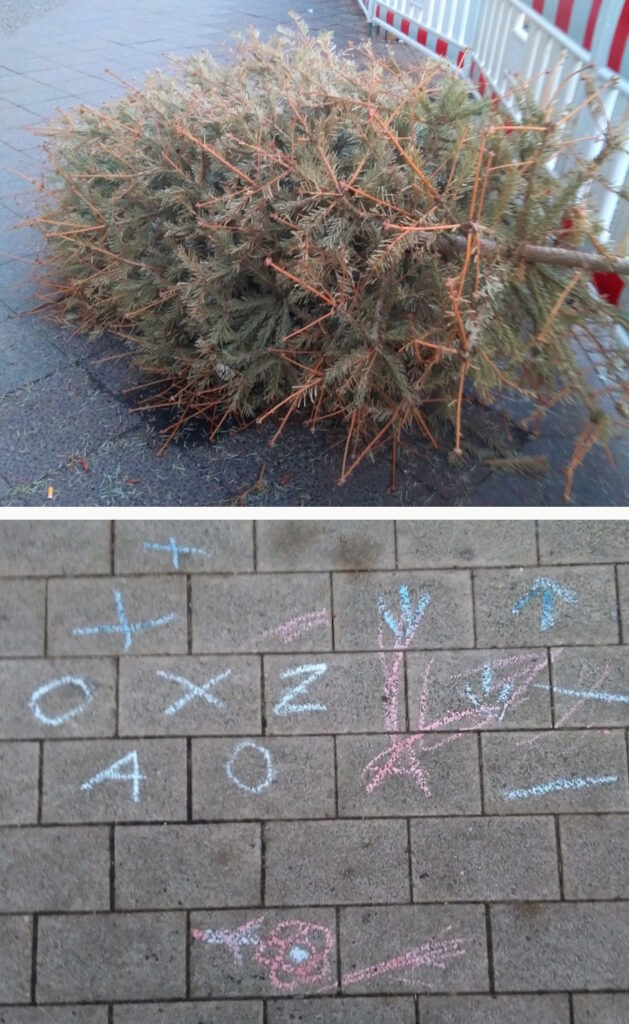 Die Temperaturen bewegten sich innerhalb einer Woche zwischen minus 9 und plus 12° Celsius. Der Schnee im Karree nun komplett geschmolzen. Der Himmel zunächst von einem hellgrauen Schleier bedeckt, dann zartblau. Die Vogelwelt sortiert sich lautsark neu. Während auf vielen Gehwegen letzte Weihnachtsbäume liegen, im Hof die erste Kinderkreidezeichnung des Jahres. Von Nachbarn holte ich mein 1,5-Kilo-Päckchen Wermutkraut ab – Bitterstoff für ungefähr anderthalb Jahre. Die Musik im Tageslauf immer weniger orchestral: Bach-Choräle, Monteverdis Madrigale, Bettellieder aus Apulien, Giovanni Gabrielis Stücke zum St.-Rochus-Fest – Rochus von Montpellier (ca. 1295-1379) war Schutzheiliger der Pestkranken, maladen Haustiere und Patron der Siechenhäuser.